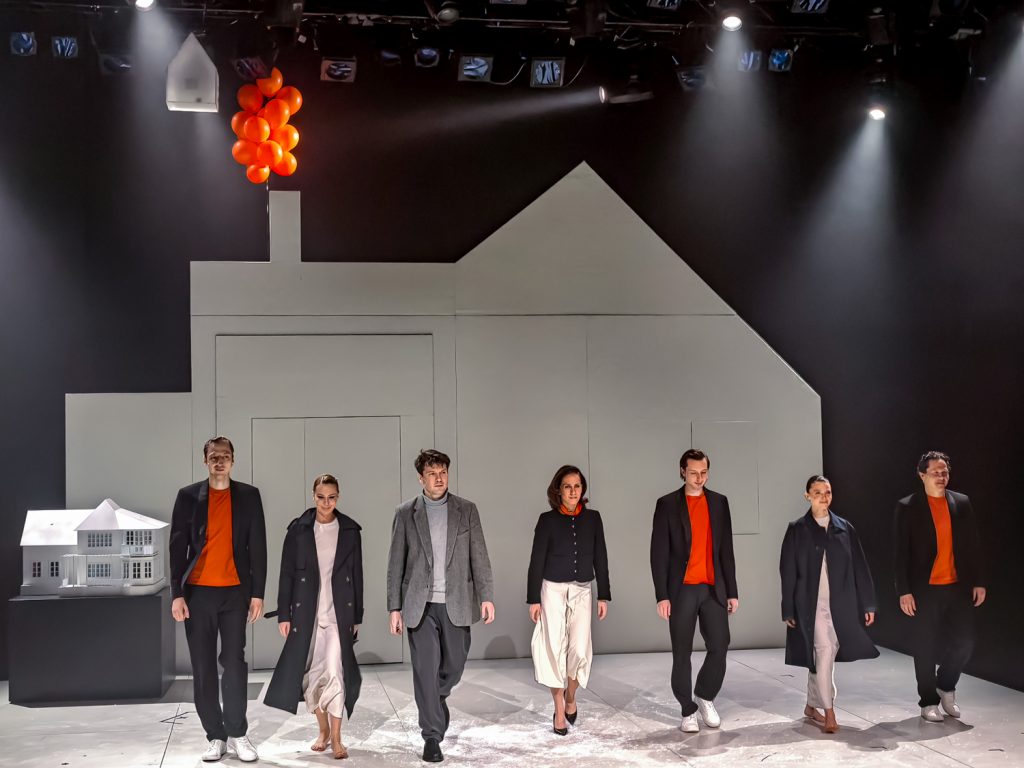 Далее — огромной эстетичности «картинка» (художник-сценограф и художник по костюмам — Мария Рогожина, художник по свету — Никита Федун, художник по видео — Илья Старилов). Белый фон — полотно сцены, как чистый лист, в качестве задника и элементов декораций — белые же «чертежи архитектора». Чёрно-серые костюмы с оранжевыми (апельсиновыми) акцентами. Замечательно. Ну, а сцена с «апельсиновым морем» — это поистине красотища.