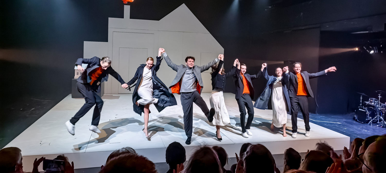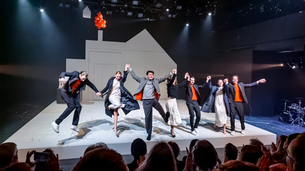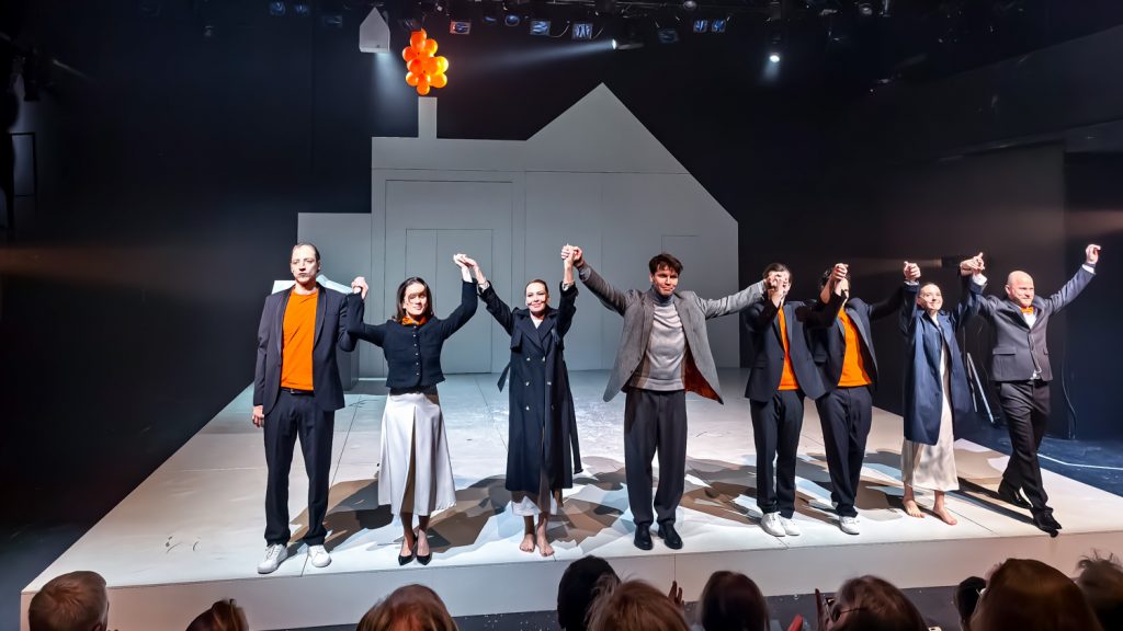 Из версии трёхлетней давности в Театр Наций также перешли Наталья Ноздрина, Игорь Кузнецов, Варвара Прокуденкова, Максим Плетнёв и Баястан Колдошалы (с ним в состав добавились Сергей Кирпичёнок и Иван Злобин). Ну, и ещё одна «новенькая» — Мария Биорк (её давно нежно люблю, и именно она стала для меня главной «завлекалочкой» на премьеру). Не каст, а слаженный, умелый механизм, с одинаковым азартом поющий, танцующий и проживающий доверенное.