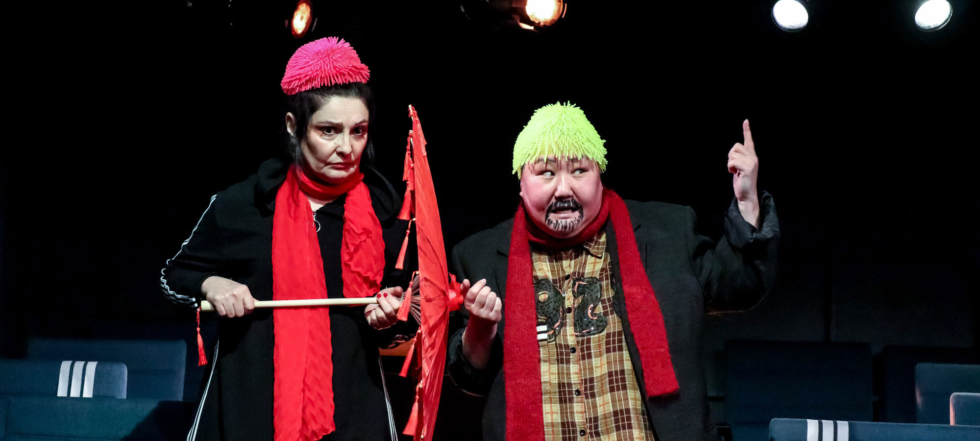 Нужно отметить, что изначально Марина Кикеева (режиссёр-постановщик, художник и автор сценической версии) опиралась на пьесу Кобо Абэ «Призраки среди нас». И, в принципе, эта история и осталась «несущей конструкцией» действа. Но в итоге всё выглядит так, как будто уличные артисты некоего небогатого японского театра решили поставить Кобо Абэ, начали это дело довольно серьёзно (пусть и с присущими для кёгэна «фичами», ибо как привыкли, как умеют, так и работают)… А потом махнули рукой — и пустились вразнос, отсекая то там, то тут ненужные строки и целые картины и действия (и как же это правильно!), делая сюжет гораздо более сконцентрированным, а потому — прицельнее бьющим в нужные точки, смещая акценты, ещё сильнее, нежели предполагал автор, утрируя и упирая на абсурдность происходящего… И в итоге рождая абсолютно новый финал (к которому, как я осознала потом, всё совершенно логично катилось с самой первой сцены), вызывающий оторопь, удивление и желание аплодировать стоя.