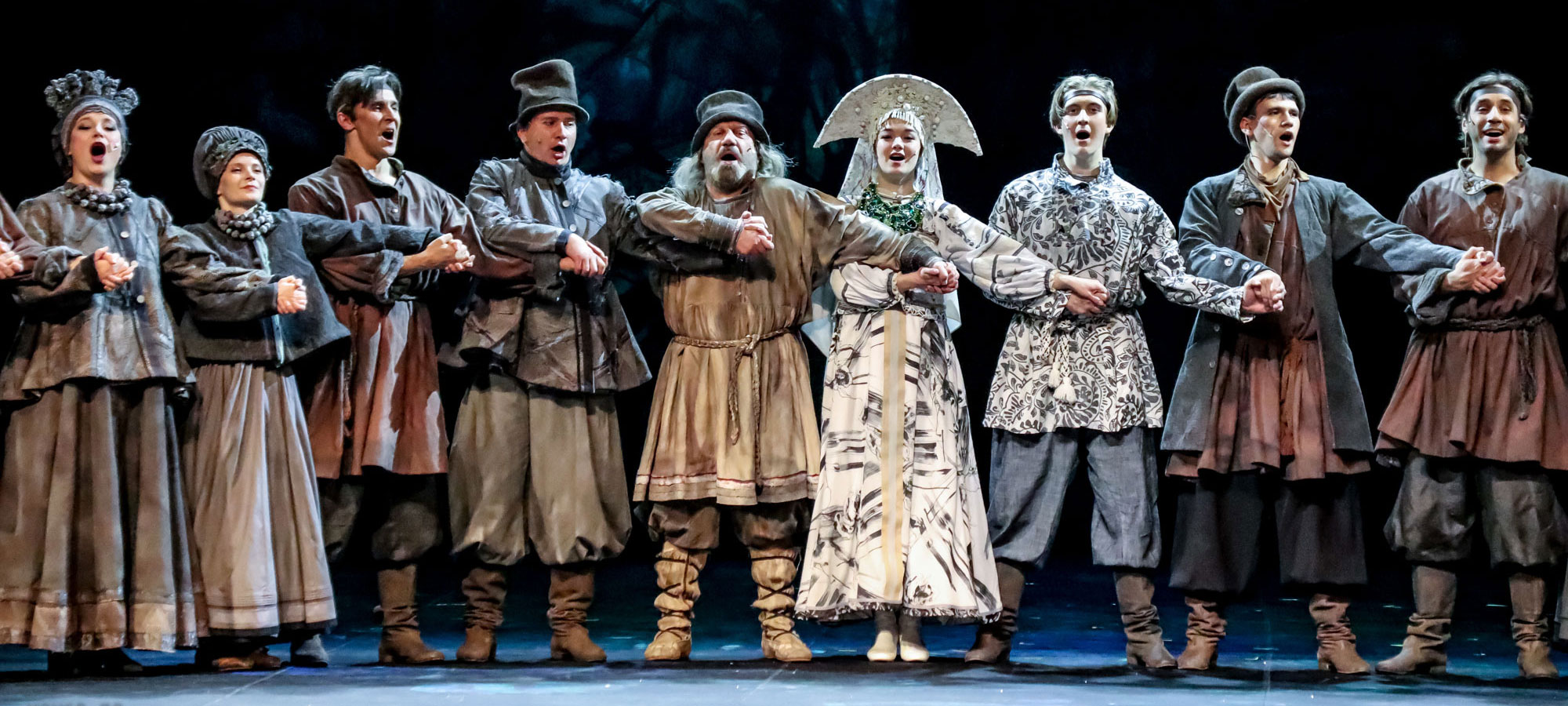 Режиссёрский почерк Терезы Дуровой поклонники театра хорошо знают, вот и свеженькая премьера их не разочарует: здесь всё масштабно, глобально, динамично, энергично и очень красиво. И, да, перед нами не мюзикл, а на самом деле музыкальный спектакль: сольные арии имеются исключительно у Хозяйки Медной горы (шикарная Анастасия Тюкова), весь остальной песенный материал доверен вокальному ансамблю, как бы комментирующему происходящее.