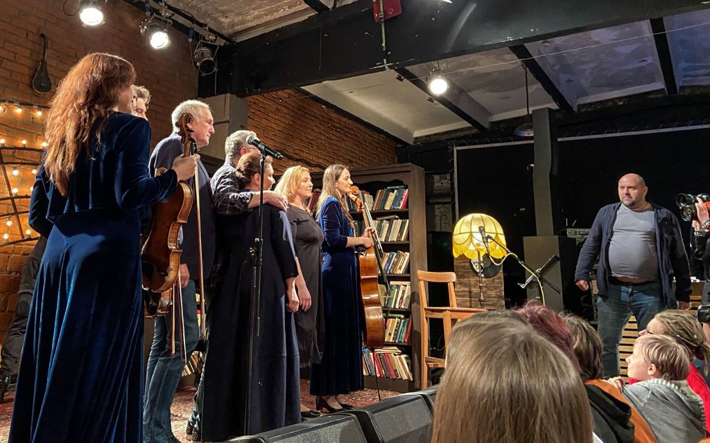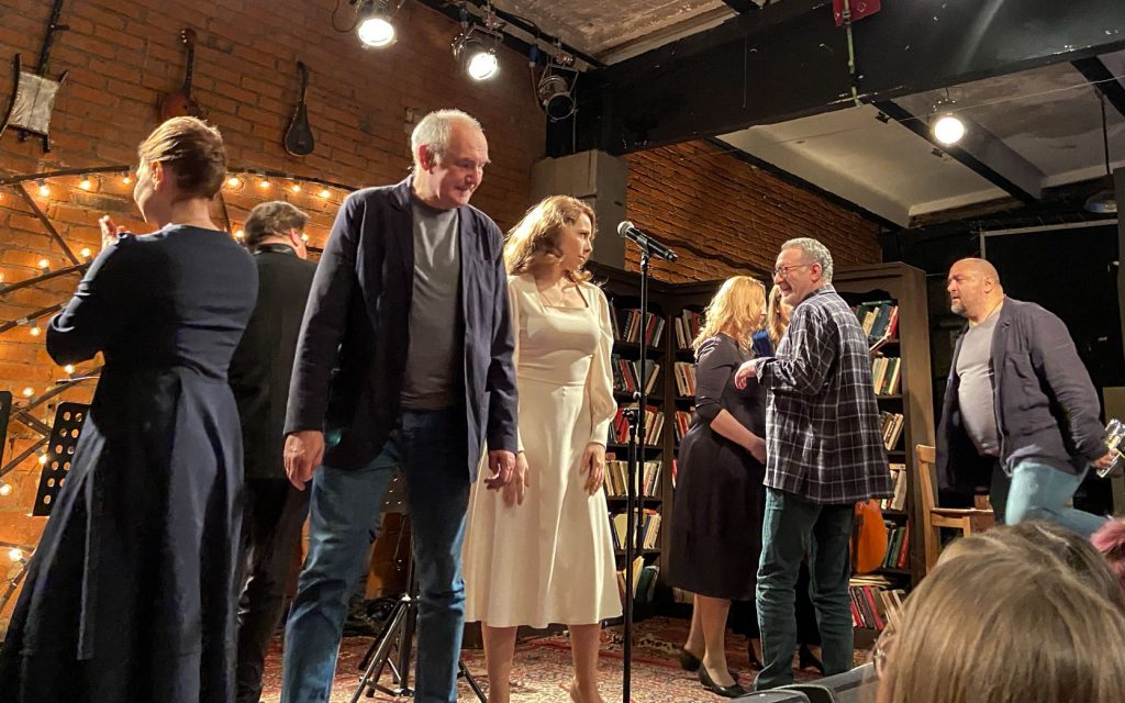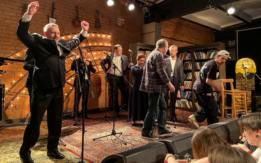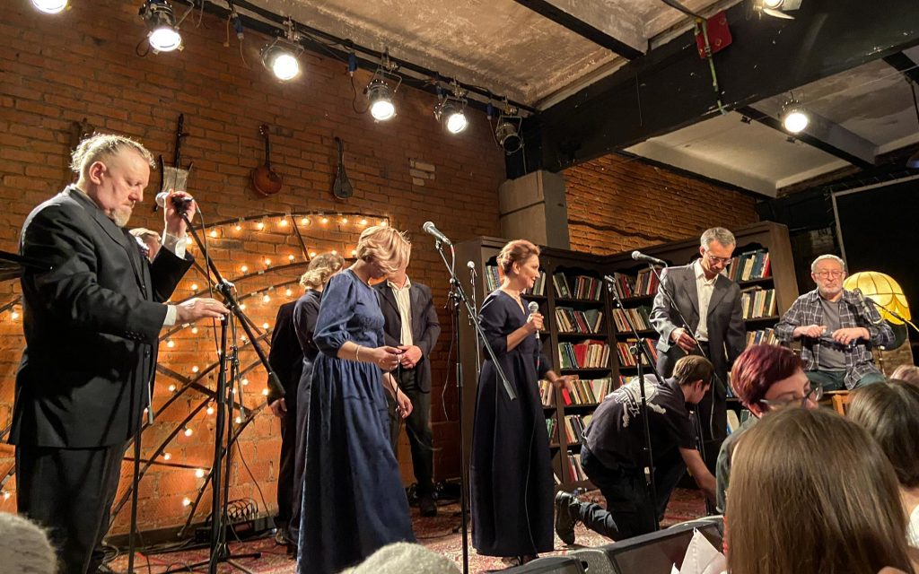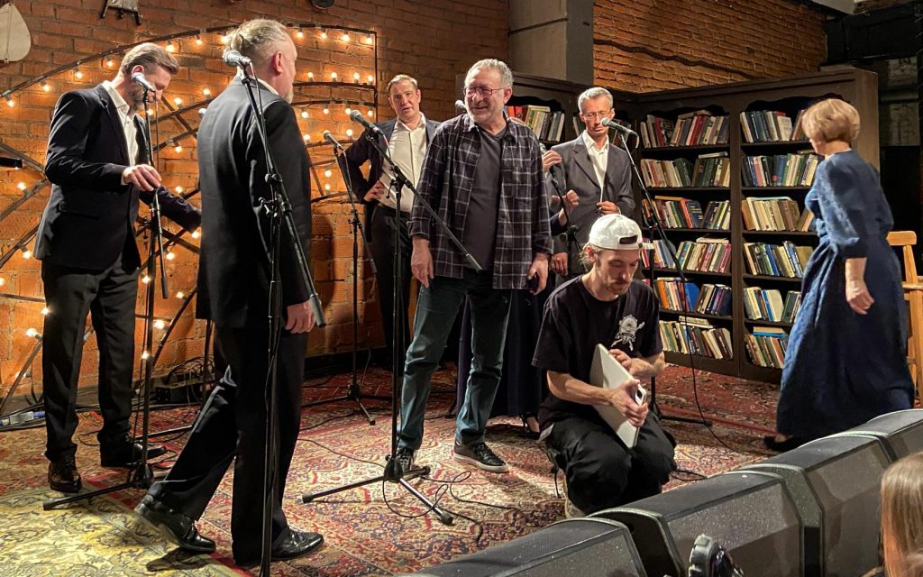 Затем квинтет музыкантов покидает студию, и выходят они — восьмёрка мощных. Те, кто (с некоторыми переменами в составе, но всё же) уже несколько лет (батюшки, я впервые оценила это аж в 2014-м… Мне казалось, это случилось позже…) дарит нам концертную версию «Норд-Оста». Перечисляю поимённо: Алексей Бобров, Антон Арцев, Пётр Маркин, Юрий Мазихин, Виктория Соловьёва, Ирина Линдт, Алексей Россошанский и Лидия Чебоксарова. Плюс бессменный концертмейстер, властительница клавиш Анастасия Зимина.