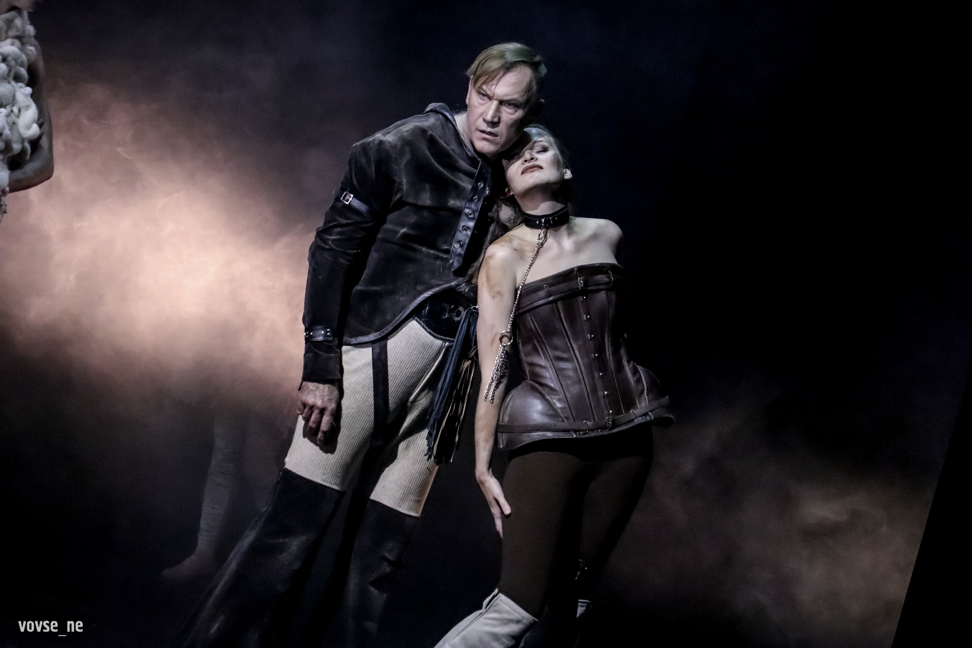 Грымов с лёгкостью берётся за столь нетривиальную задачу — к тому же не будем забывать, что Юрий Вячеславович — прославленный кинорежиссёр, далеко не впервые сочетающий два похожих по форме, но столь различных по сути искусства: театр и кино. Как и прежде, за световой дизайн отвечал лично постановщик — и, по давней традиции Грымова, получился у него, скорей, не сценический свет, но сценическая темнота. И на сей раз в принципе не возникает вопроса, почему сделано именно так: пятна света работают, как крупный план на экране, выхватывая из полутьмы то одного, то другого героя.