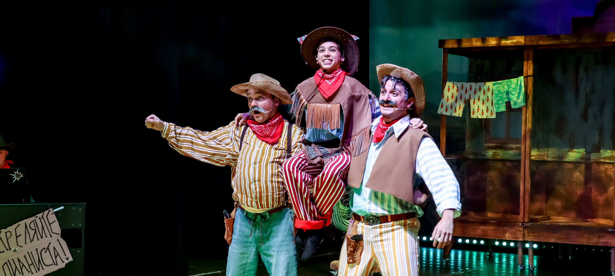 Единственное, подготовьтесь к посещению театра — подучите матчасть. Убедитесь, что ваш наследник разбирается в проблемах дикого Запада, отличает ковбоев от индейцев и сходу ответит на вопрос, кто такой вождь краснокожих. И вторую тему с ним обсудите: кто и зачем ворует детей, что такое выкуп, как следует относиться к киднепперам (заодно и правила безопасного поведения повторите — это лишним никогда не бывает). Это нам кажется, что всё ясно и понятно, а малыши, не зная основ, мало что уяснят из показанного на сцене.